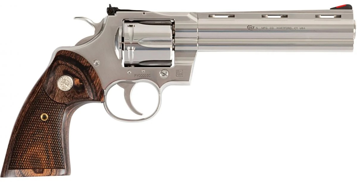 The Python features modern stainless steel alloys and a re-designed rear sight. Thirty percent more steel beneath the rear adjustable target sight gives you a stronger revolver and more robust shooting experience. A recessed target crown, user-interchangeable front sight and Walnut grip with the iconic Colt medallion. The Python is chambered in .357 Magnum and also accommodates 38 Special cartridges.